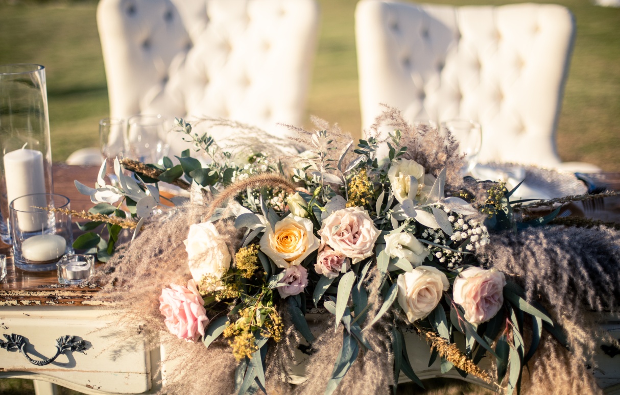 - Triangular wooden arch with mixed greenery, roses and pampas
