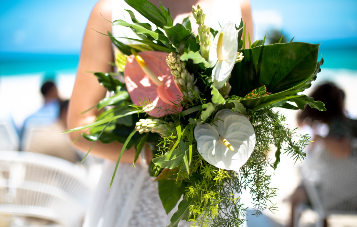 - One themed bridal bouquet with mixed anthuriums and tropical leaves and one white nardo flower or a pink ginger flower with green detail boutonnière OR two bouquets OR two boutonnières